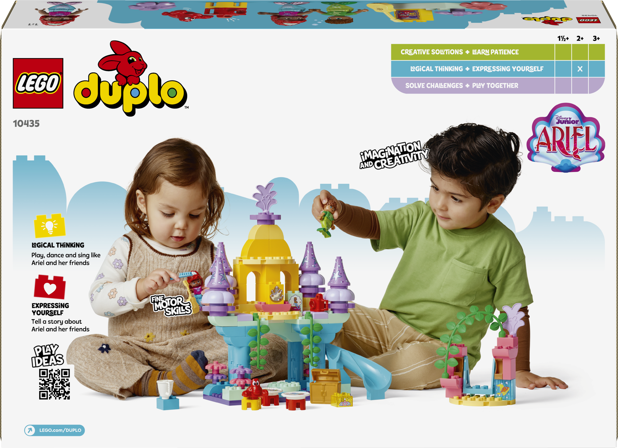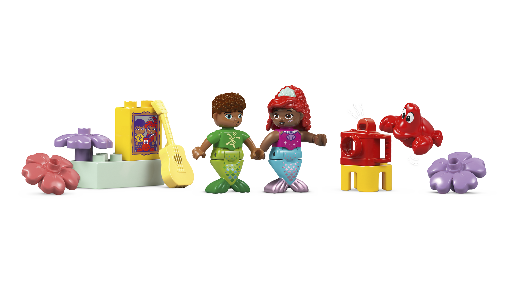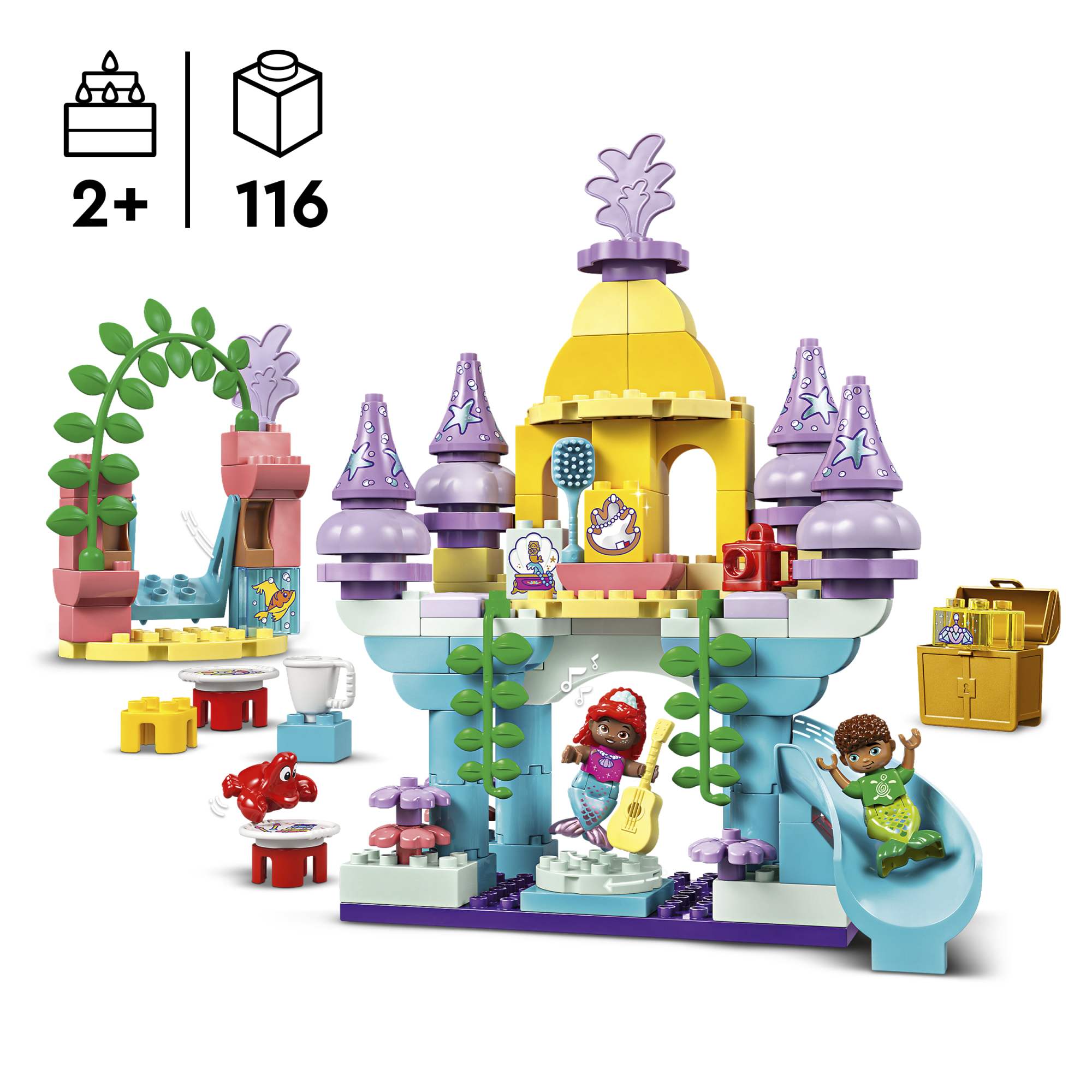 • Kolm tuttavat tegelaskuju – koolieelikud saavad avastada Disney Juniori telesarjast Ariel pärit kokkupandava mängulossi maagilise funktsioone koos LEGO® DUPLO® Arieli, Fernie ja Sebastiani figuuridega