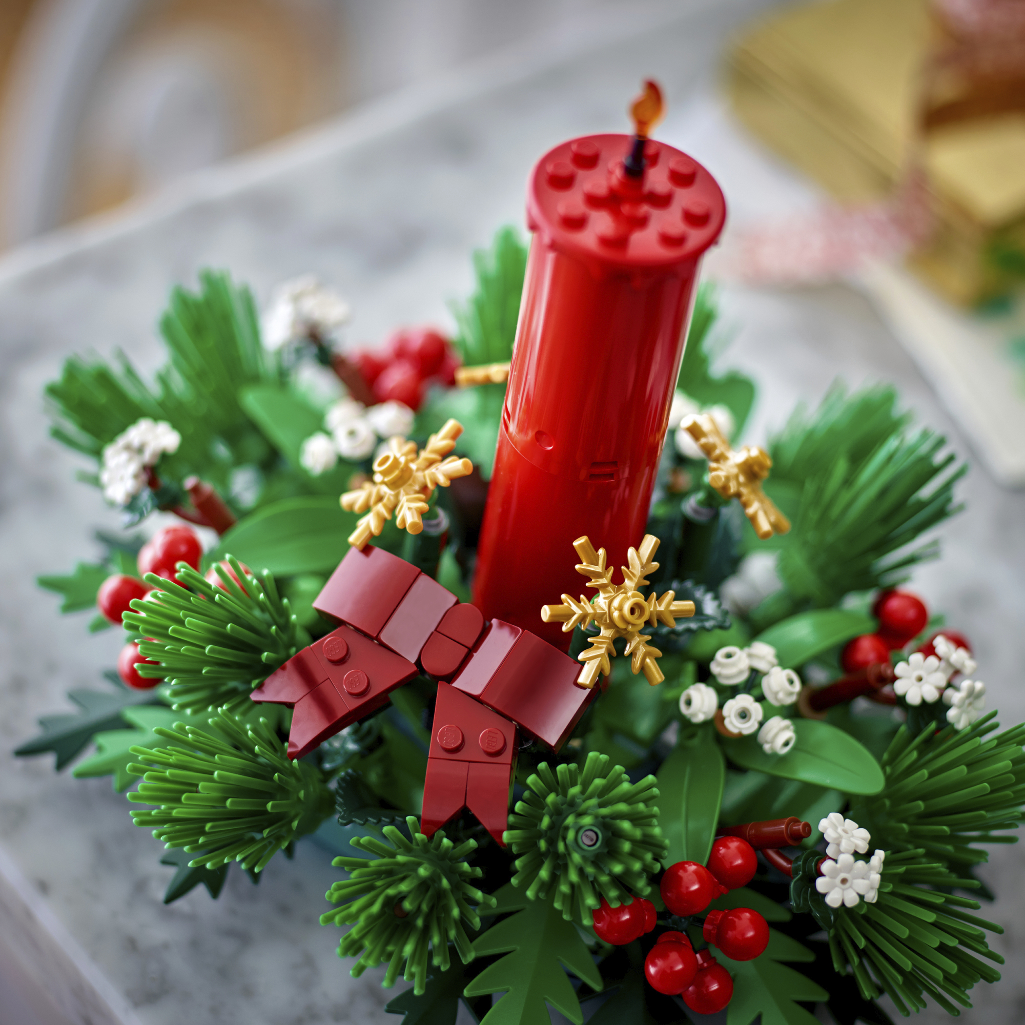 • Pidulik rõõm – LEGO® jõulukomplekti keskel on punane küünal, mida ümbritsevad punased marjad, kuldsed tähed ja roheline lehestik