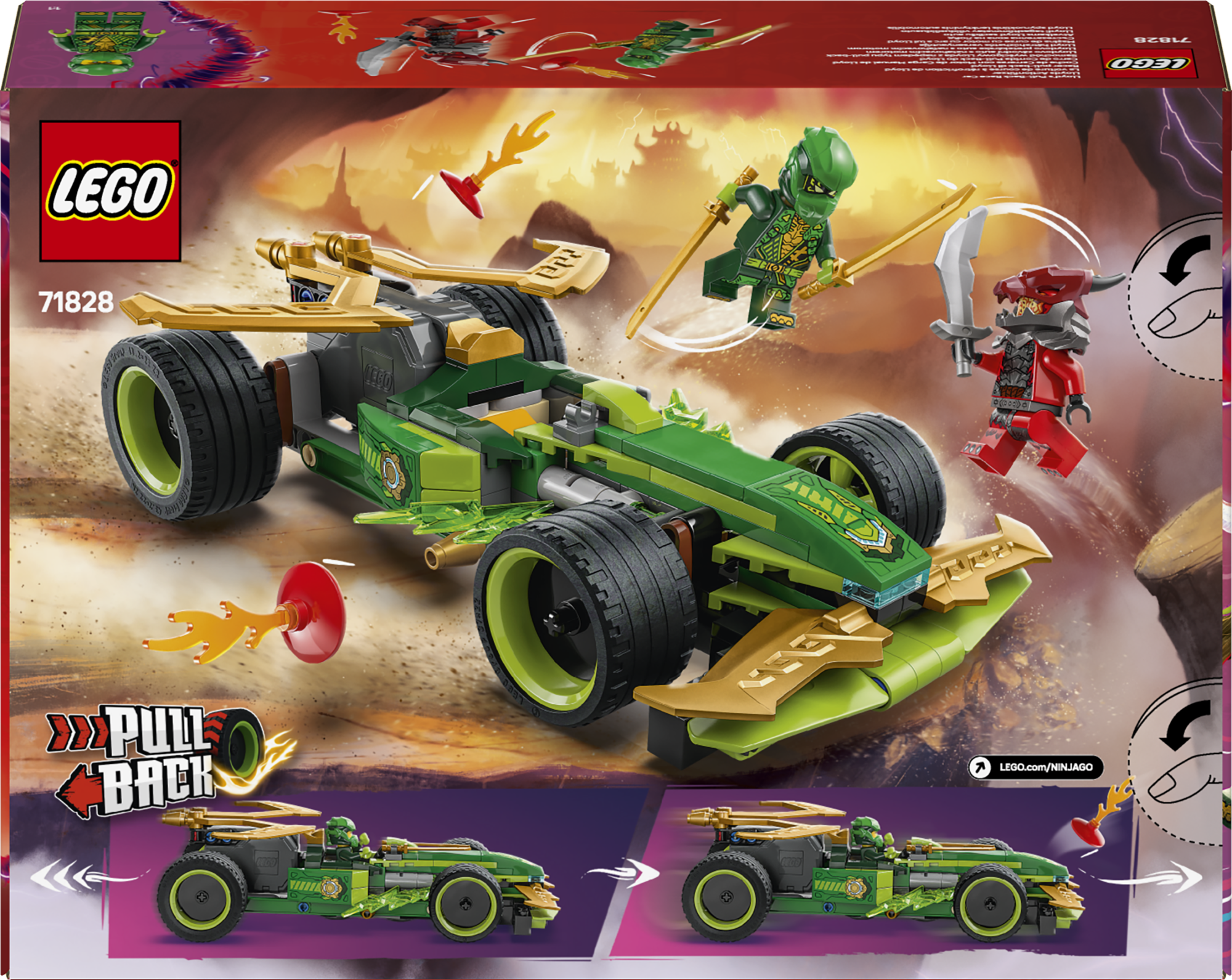 • NINJAGO® esimene tagasitõmmatav auto – lapsed saavad Lloydi tagasitõmmatava võidusõiduauto kihutama panna, tõmmates seda tagasi ja siis lahti lastes