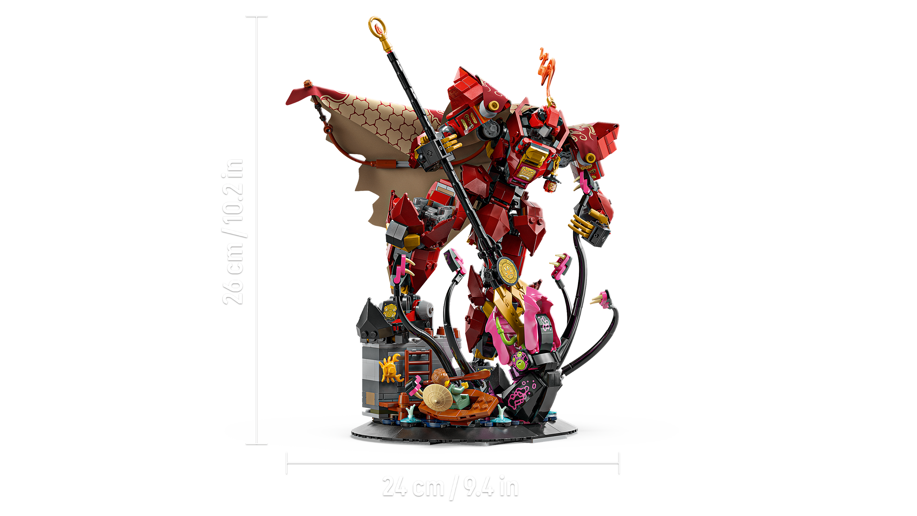 • Interaktiivne mudel – ninjafännid saavad mudeli selle alusest eemaldada, et lavastada lahinguid sarjast NINJAGO® Legends Monstrosity muudetava asendiga roboti ja liikuvate kombitsatega koletise vahel