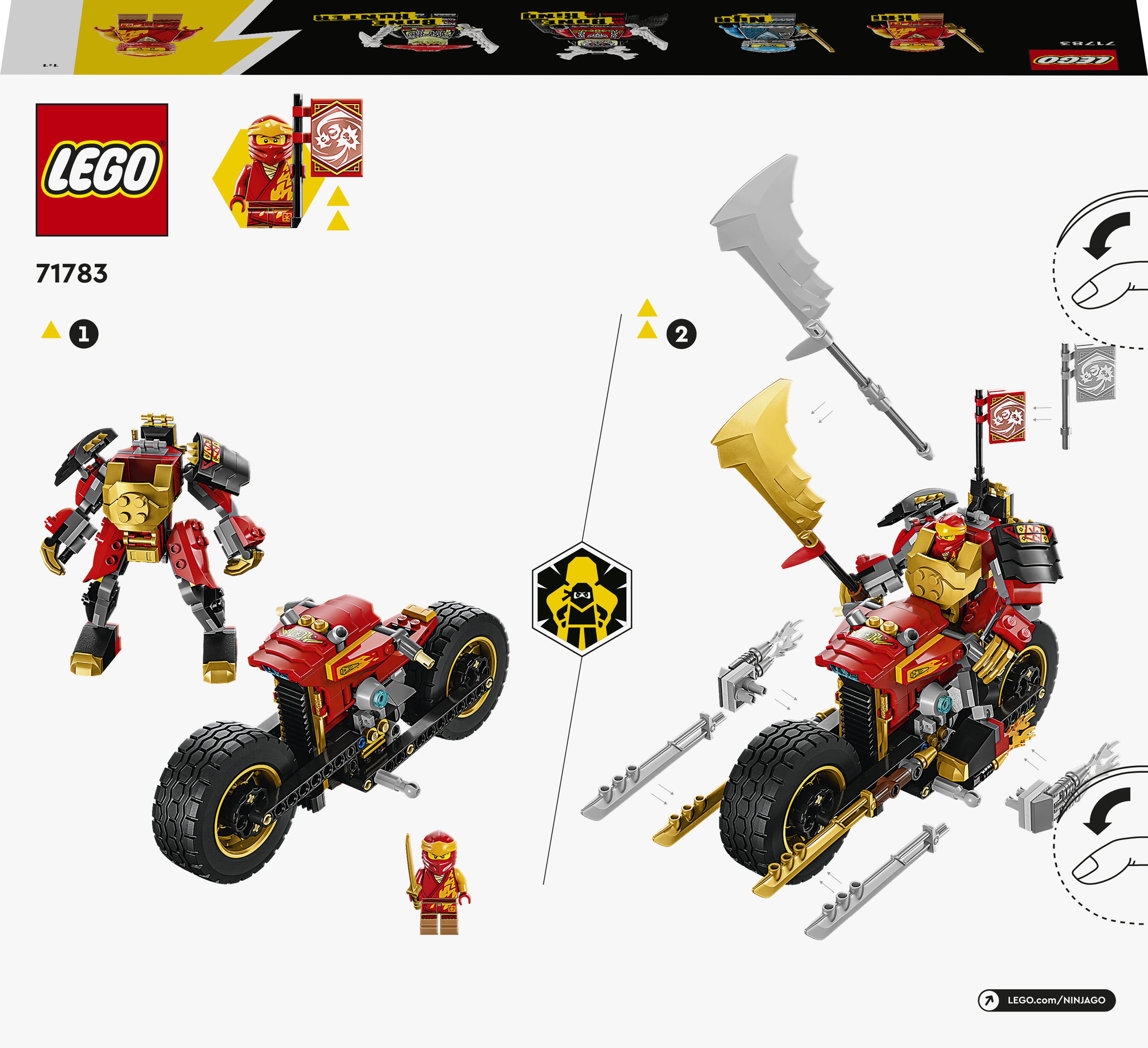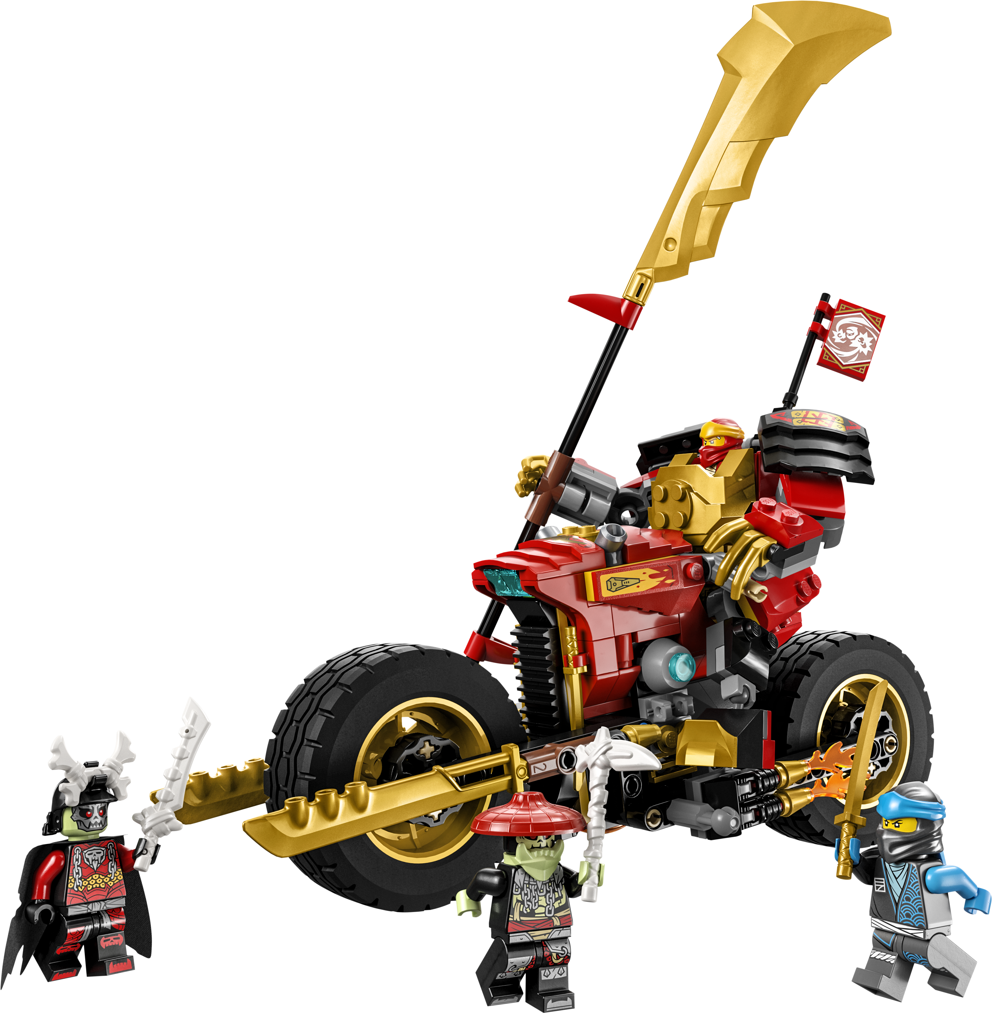 • Ninjasõiduk – lapsed ja kirglikud mootorrattafännid leiavad sellest ninjamootorratta ja robotiga NINJAGO® Kai robotisõiduki EVO (71783) mängukomplektist kõik, mida on vaja lahingute korraldamiseks
