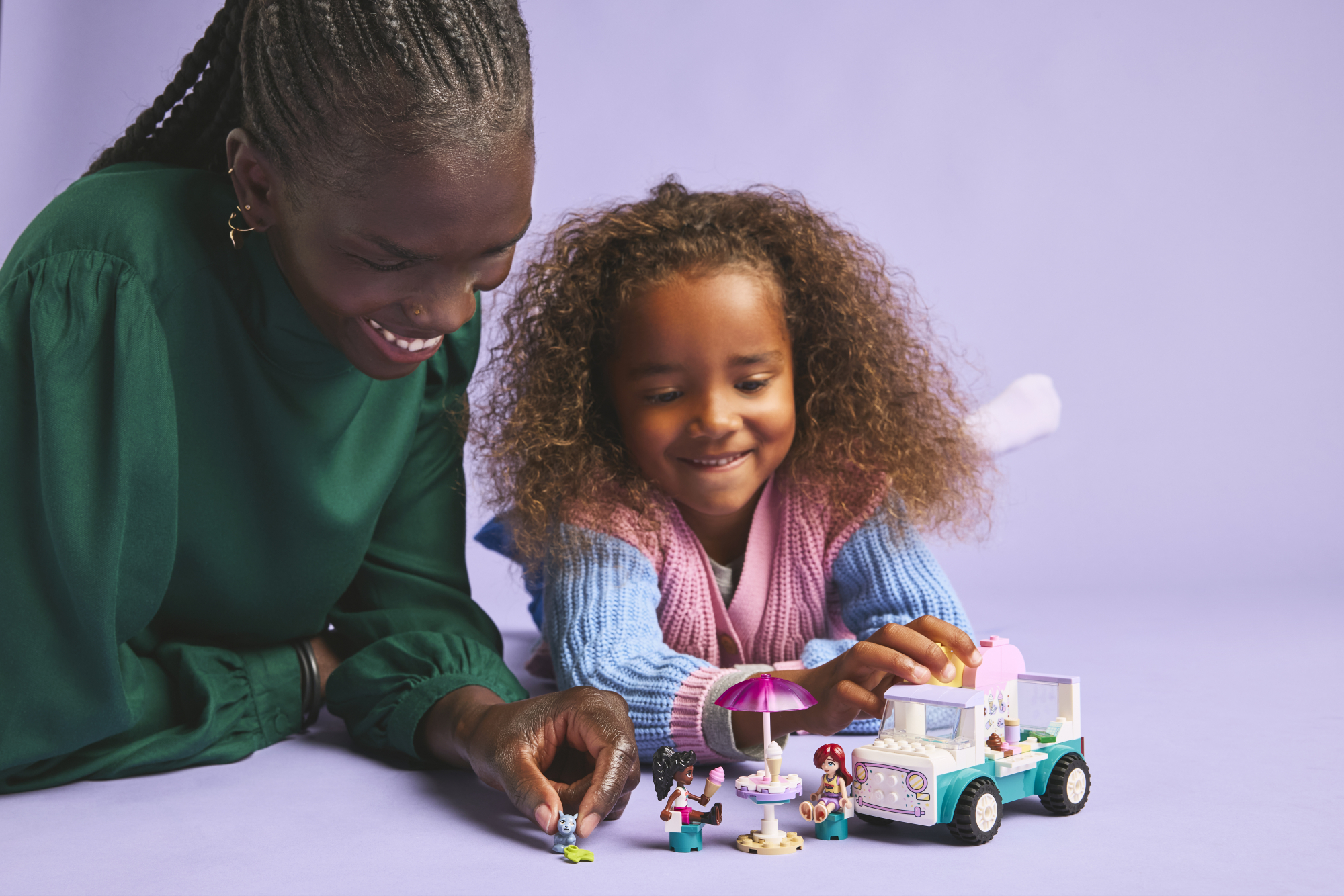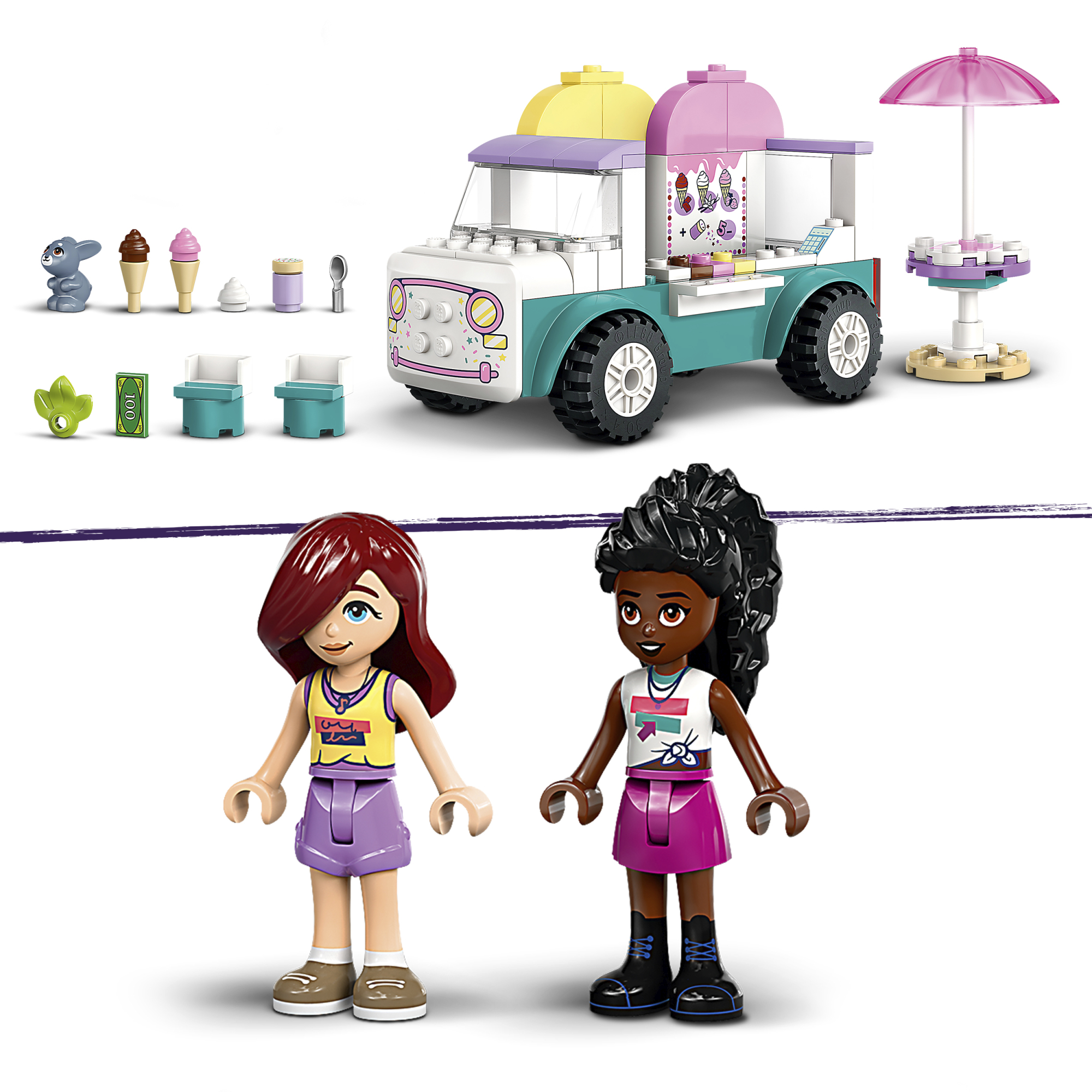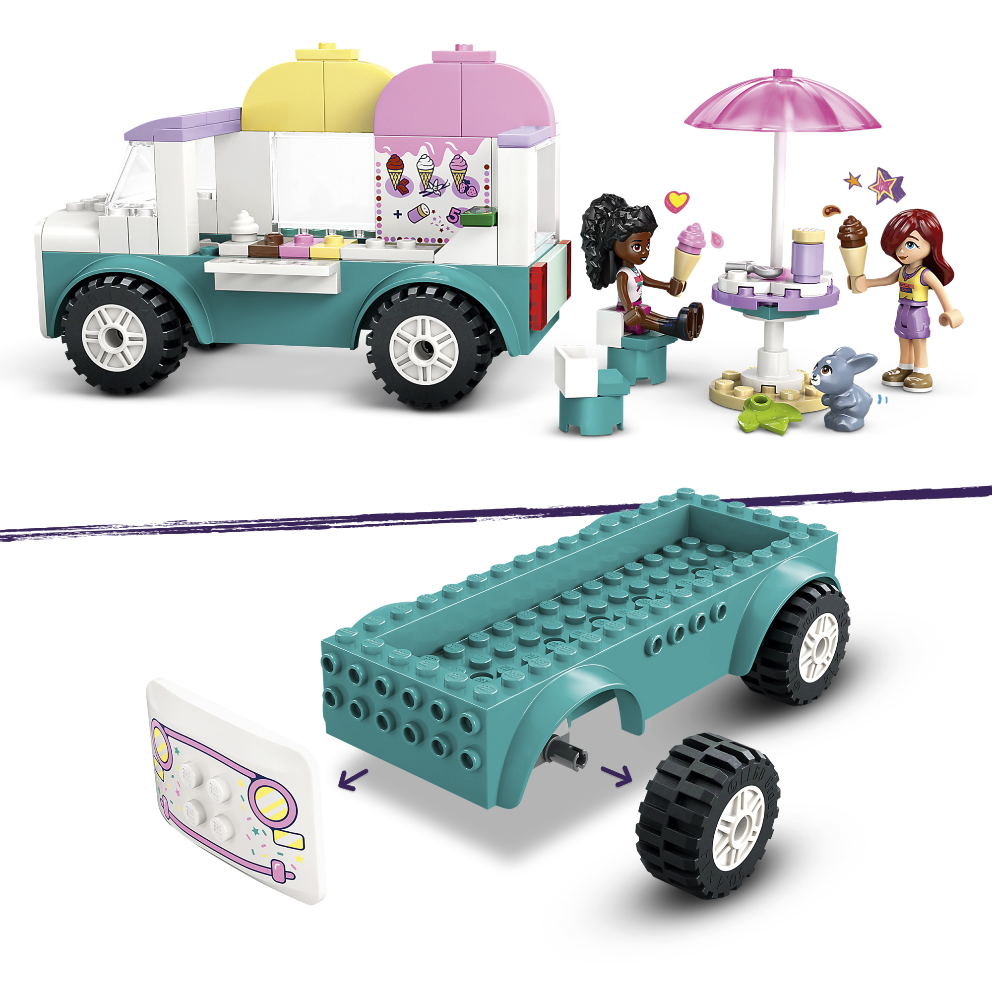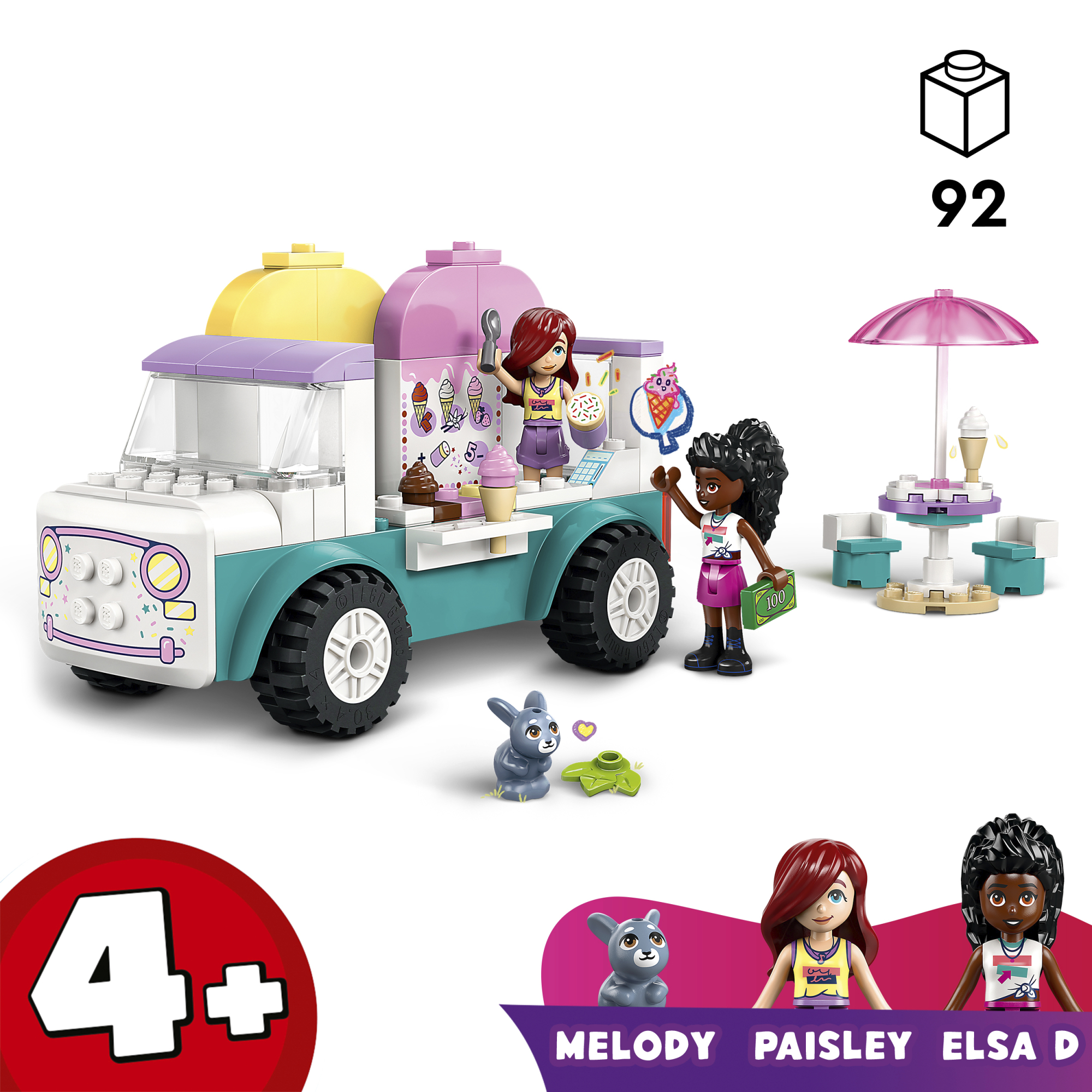 • Jäätiseauto ehituskomplekt – selle 4-aastaste ja vanemate tüdrukute ja poiste jaoks mõeldud Heartlake’i linna jäätiseautoga on kaasas 2 mininukku, jänkufiguur ja tarvikud loominguliseks mänguks