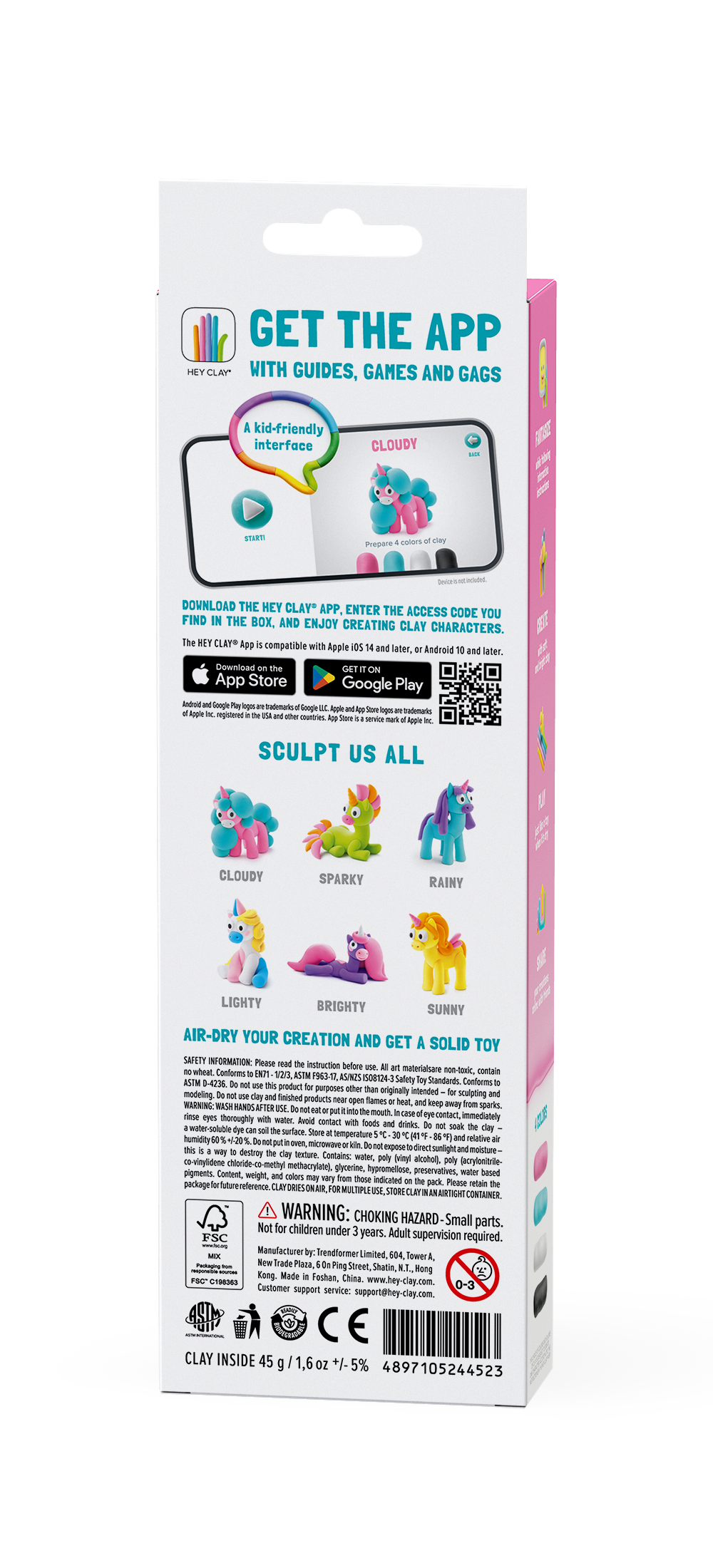 Tegelaskujude voolimise juhend: laadi alla HEY CLAY äpp, sisesta karbist leitud kood, järgi äpi õpetusi ja vooli oma tegelane valmis. Kui soovid, lase kujutlusvõimel lennata ja meisterda ilma äppi kasutamata. Lase voolitud kujul üks ööpäev õhu käes kuivada, et laps saaks sellega mängida. Kui soovid voolimismassi korduvalt kasutada, hoia seda suletud topsides, et kaitsta voolimismassi kuivamise eest.
