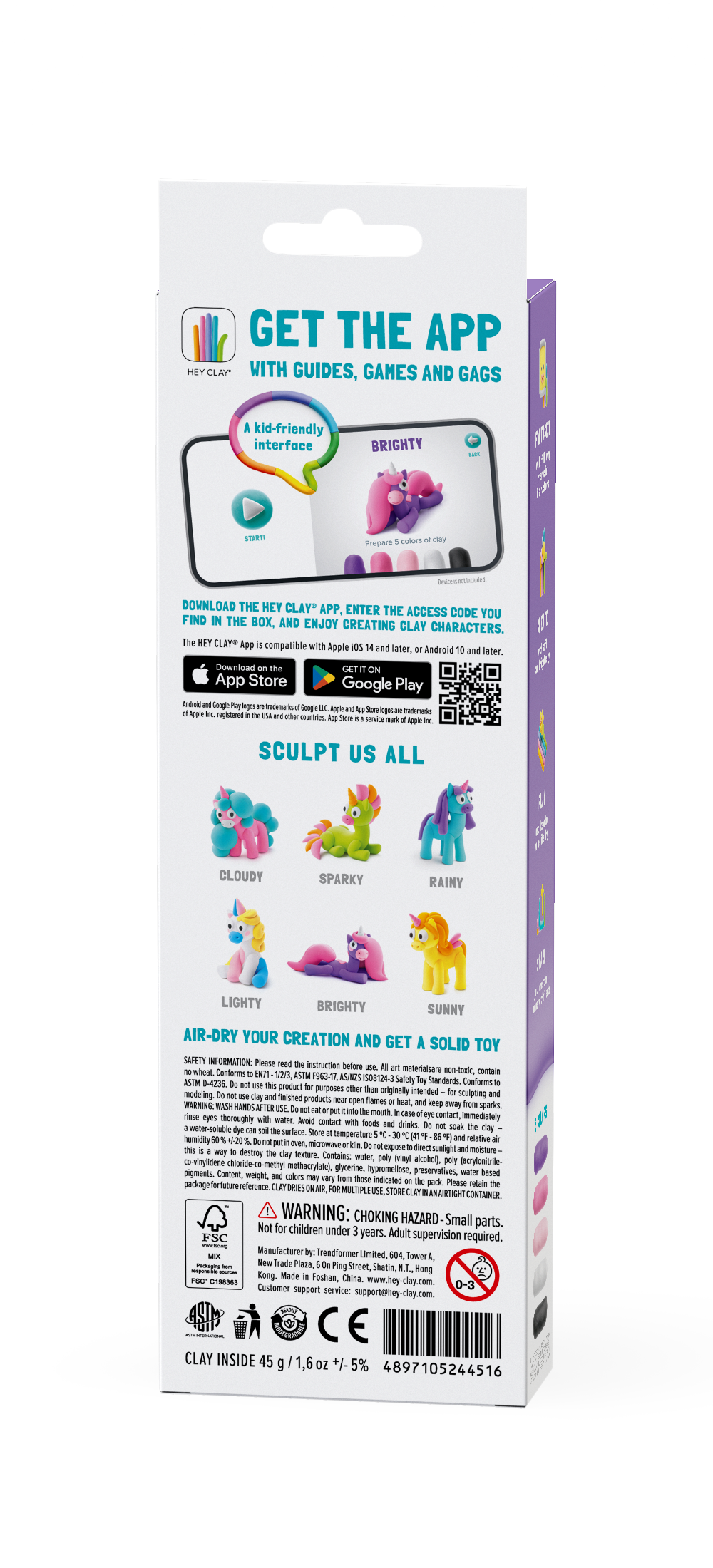 Tegelaskujude voolimise juhend: laadi alla HEY CLAY äpp, sisesta karbist leitud kood, järgi äpi õpetusi ja vooli oma tegelane valmis. Kui soovid, lase kujutlusvõimel lennata ja meisterda ilma äppi kasutamata. Lase voolitud kujul üks ööpäev õhu käes kuivada, et laps saaks sellega mängida. Kui soovid voolimismassi korduvalt kasutada, hoia seda suletud topsides, et kaitsta voolimismassi kuivamise eest.