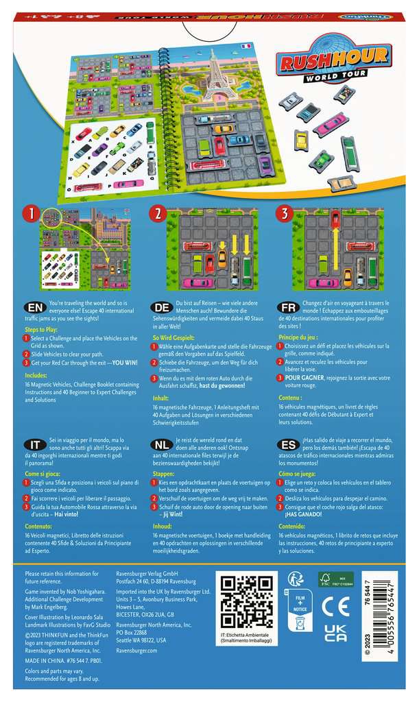 Mugav pakend kaasa haaramiseks, et mängida ja treenida mõistust kas lennukis, rongis või lihtsalt kohvikus sõpradega aega veetes. Magnetelemendid lisavad põnevust, muutes iga manöövri kaasahaaravaks. Rush Hour World Tour Magnetics Travel Puzzle paneb proovile probleemide lahendamise oskused ja hoiab meelt teravana, et vallutada linnade liiklusmõistatusi kogu maailmas. See mäng tagab lõbu ja meelelahutust pikaks ajaks. Nii et pakkige kotid, kinnitage turvavöö ja valmistuge Rush Hour World Touri maailmatuuriks.
