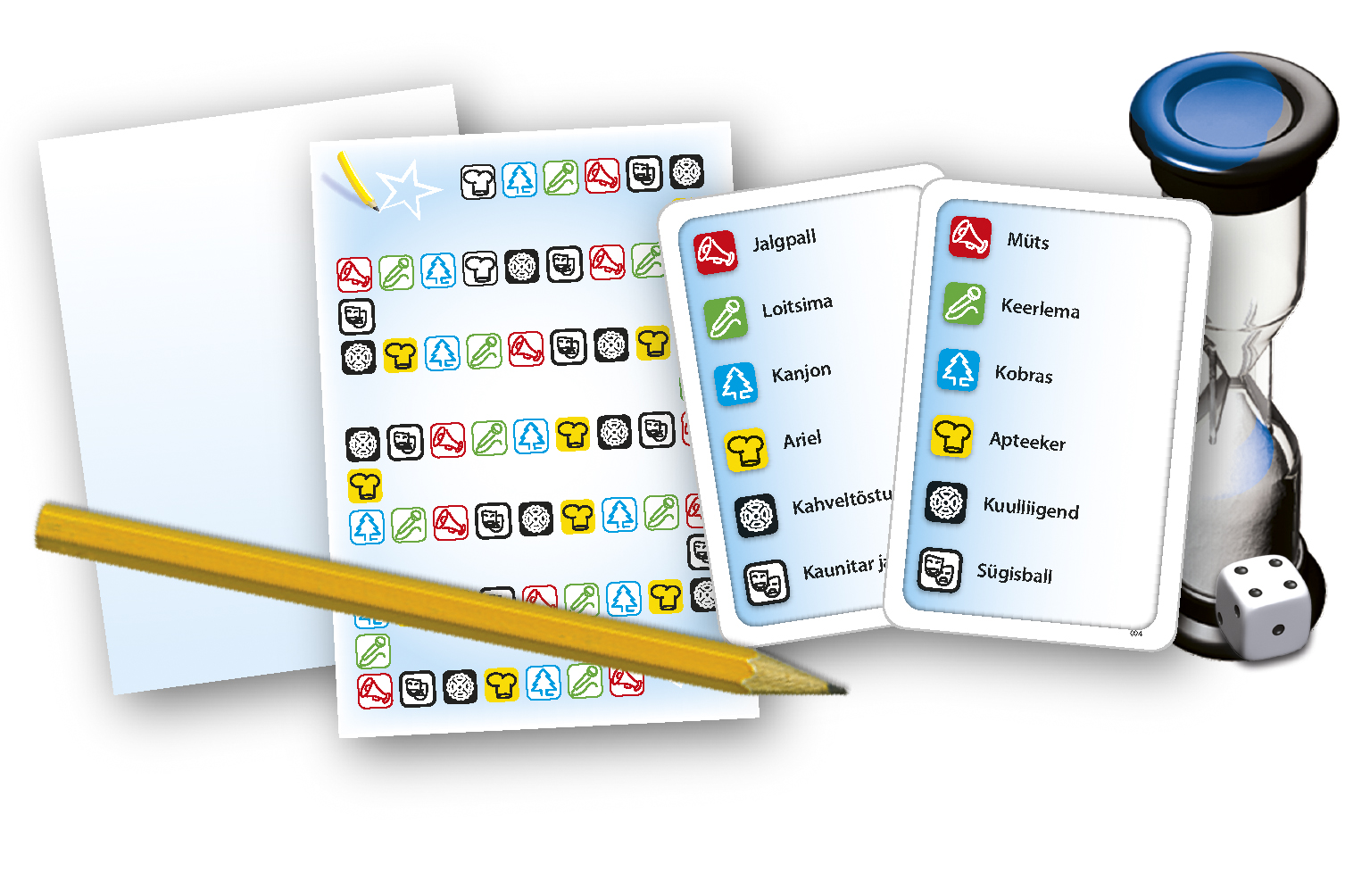 Mängukarp sisaldab: 50 kaarti, mängulehtede plokk, joonistusplokk, pliiats, liivakell ja täring