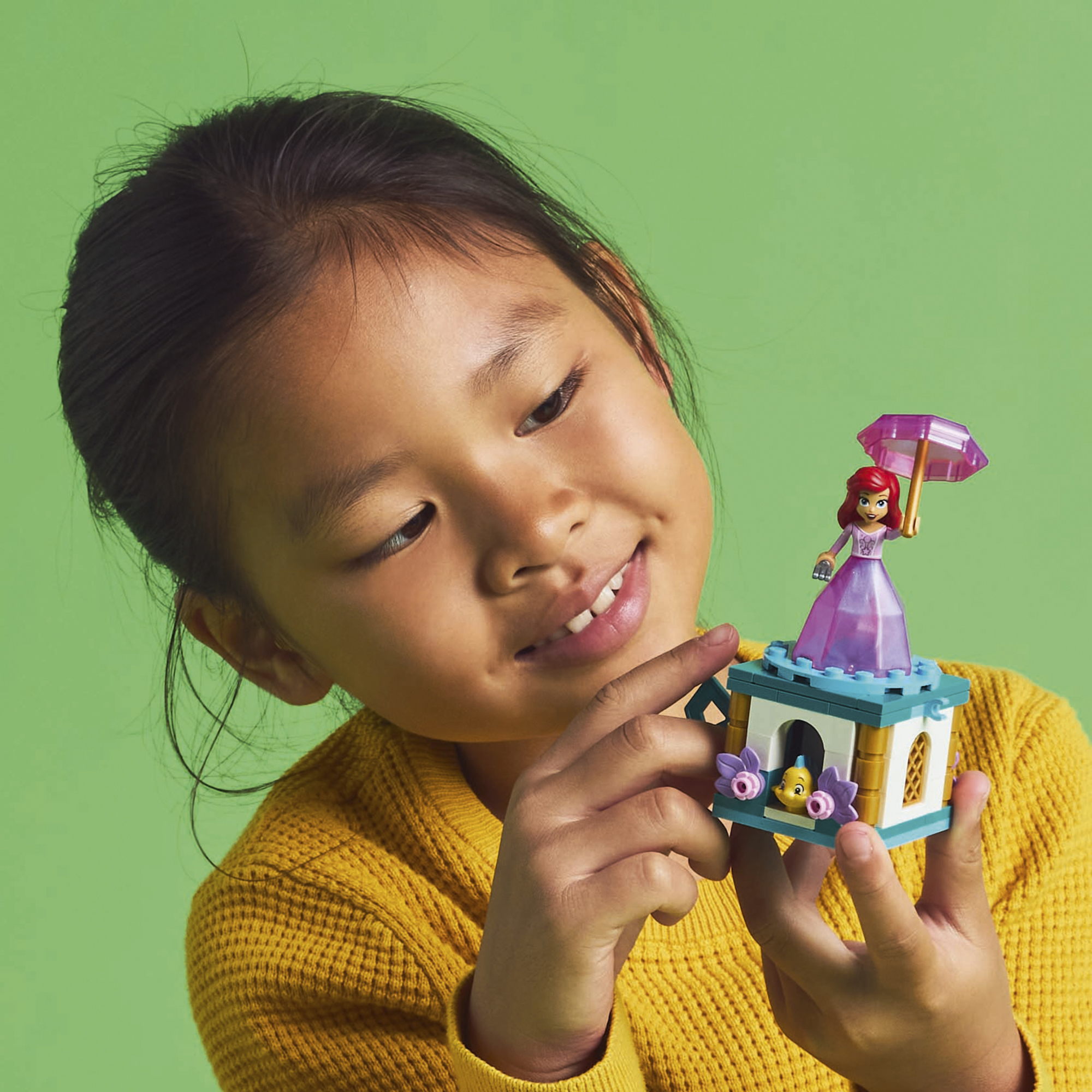 • Kaasahaarav ehitusmänguasi – pööra alusel olevat võtit ja keeruta Arieli ringi, seejärel hoia LEGO® ǀ Disney mininukufiguuri kalliskivikleidi sees, kasutades vihmavarju kaanena