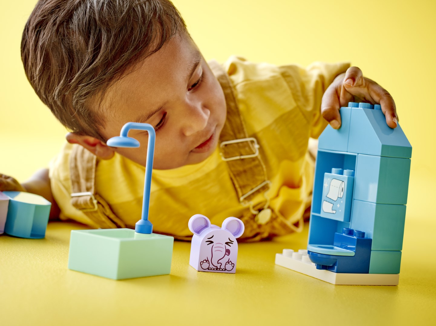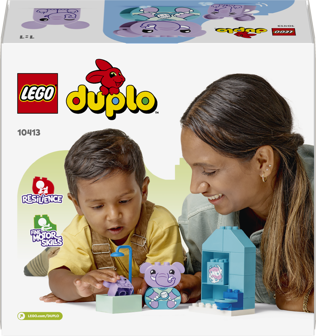 • Väikelapse õppemänguasi – kaasas on kaks elevandimänguasja, lisaks tualett, vann ja dušš, mis on ehitatud vastupidavatest LEGO® DUPLO® klotsidest ning elementidest, et harjutada pesemisrutiine lõbusal viisil