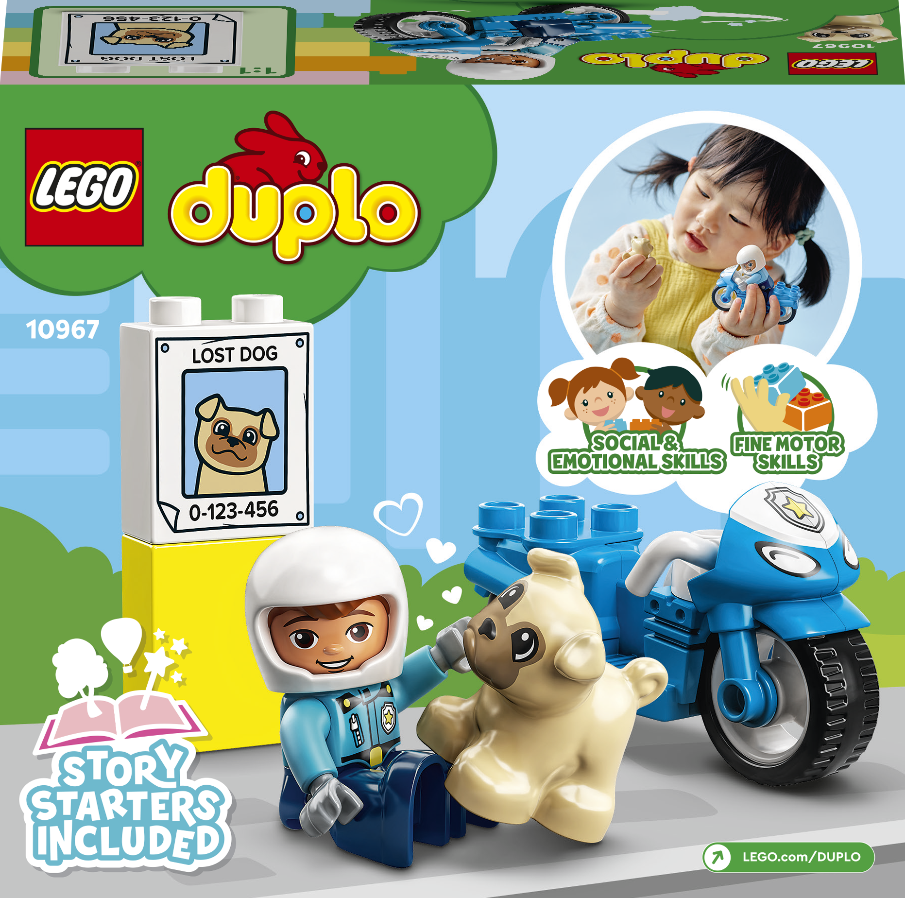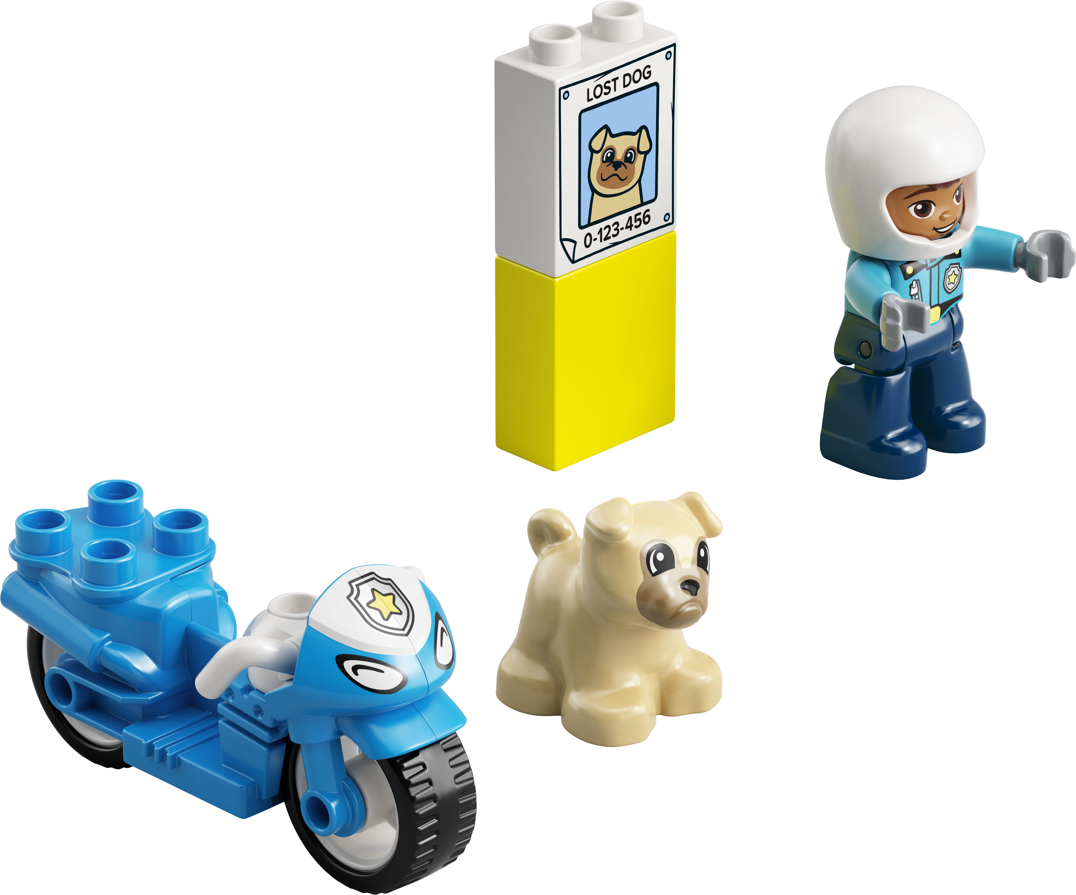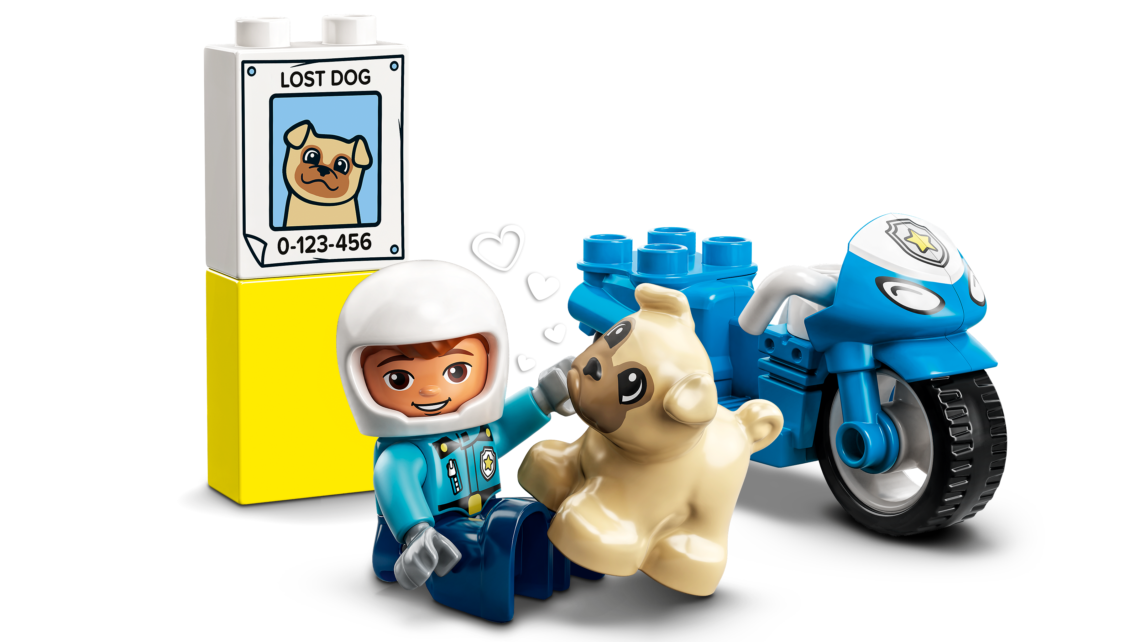 • Innustab loovalt mängima – komplektis on kaks LEGO® DUPLO® figuuri (politseinik ja armas koerake), plakat „Kadunud koer“ ja lisaks lahe sinine politseimootorratas, millega politseinik ja koer saavad sõita