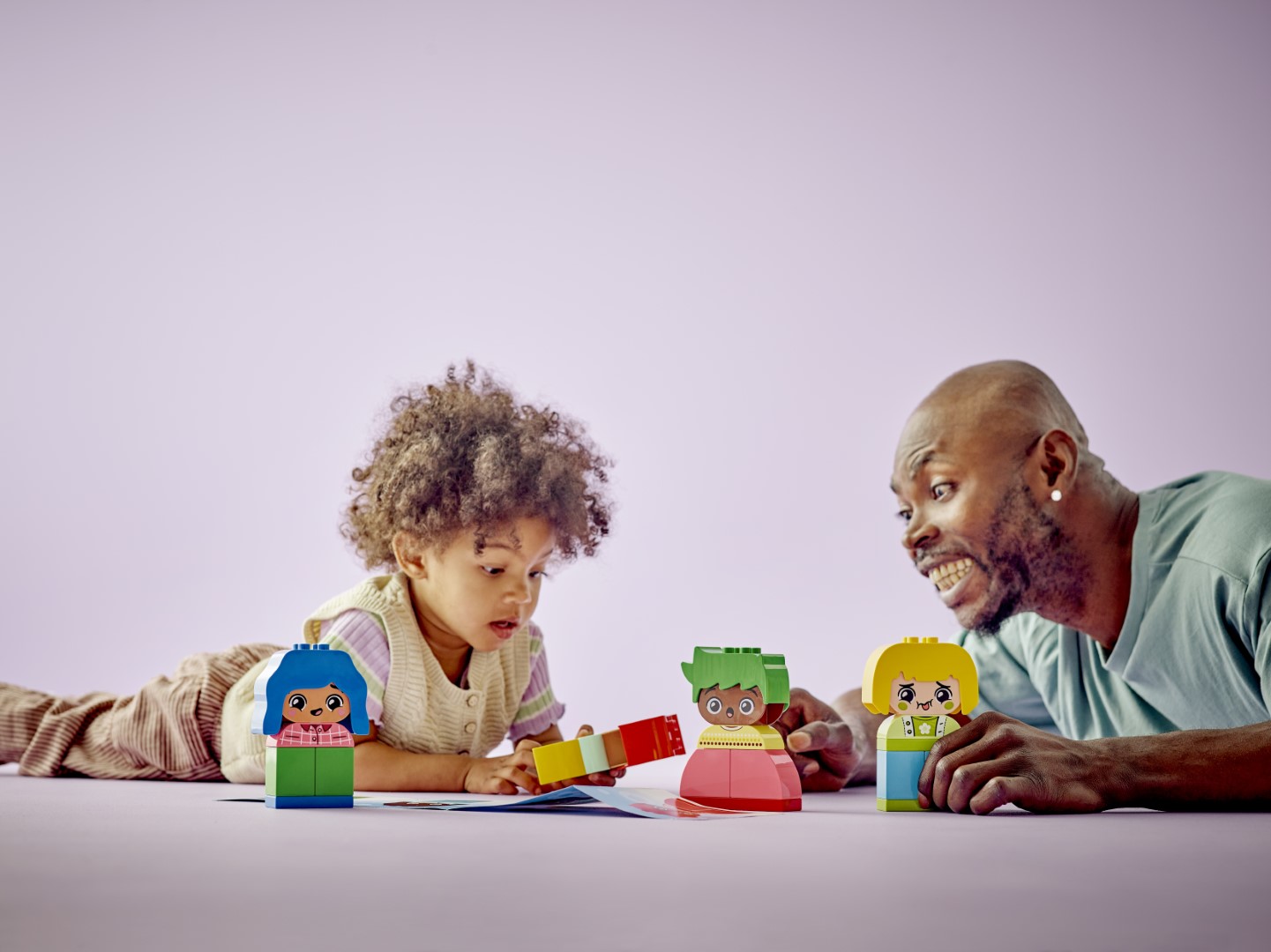 • Loovad õppemänguasjad – värvilisi mänguklotse virna ladudes sobitavad väikelapsed tegelaskujudele parukaid, seejärel valivad näoklotsidega, kuidas LEGO® DUPLO® inimesed end tunnevad