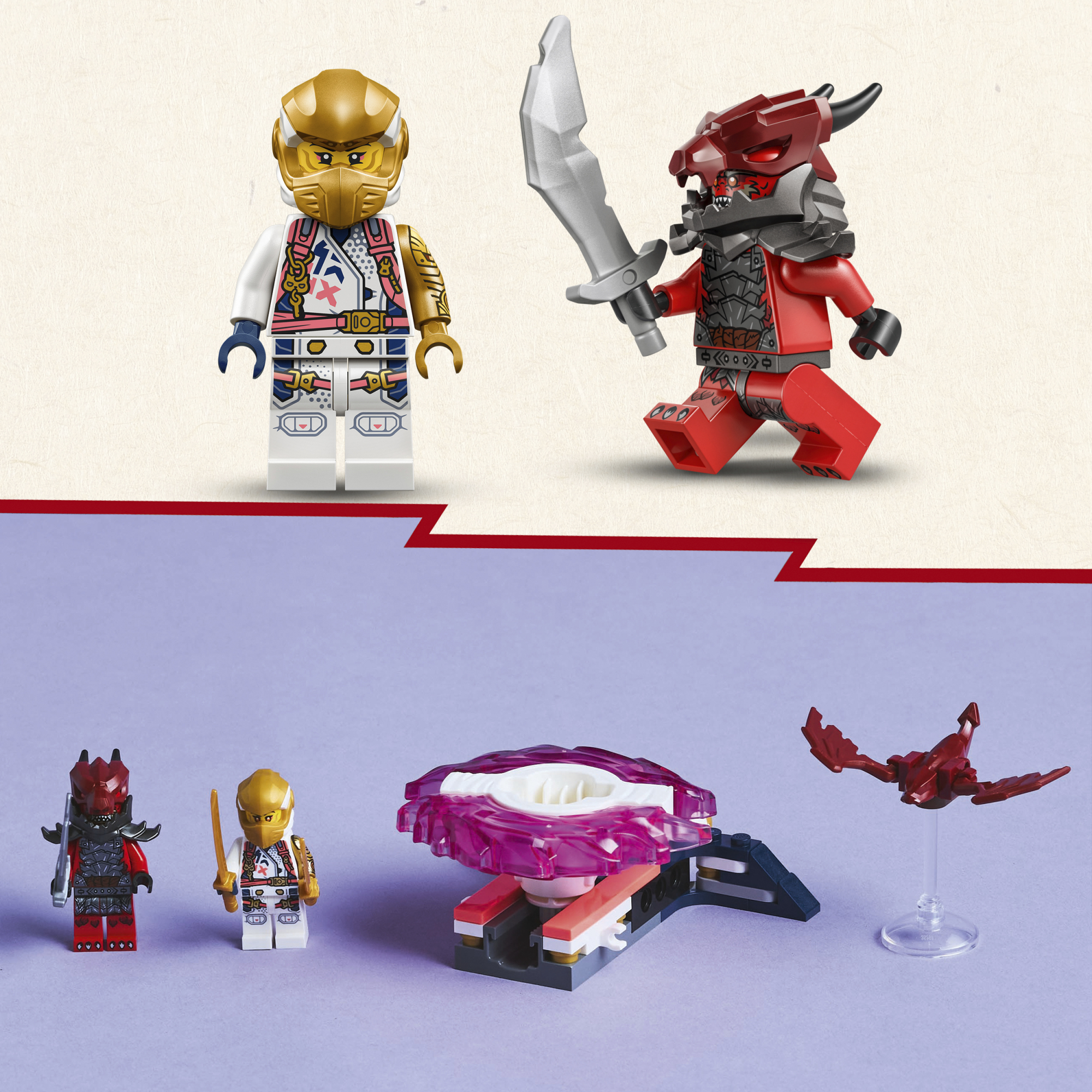 • Relvatarvikud – igal NINJAGO® tegelaskuju minifiguuril on relv, mis pakub mänguväärtust: Soral on kaasas mõõgatarvik ja draakonisõdalasel on samuti mõõgatarvik