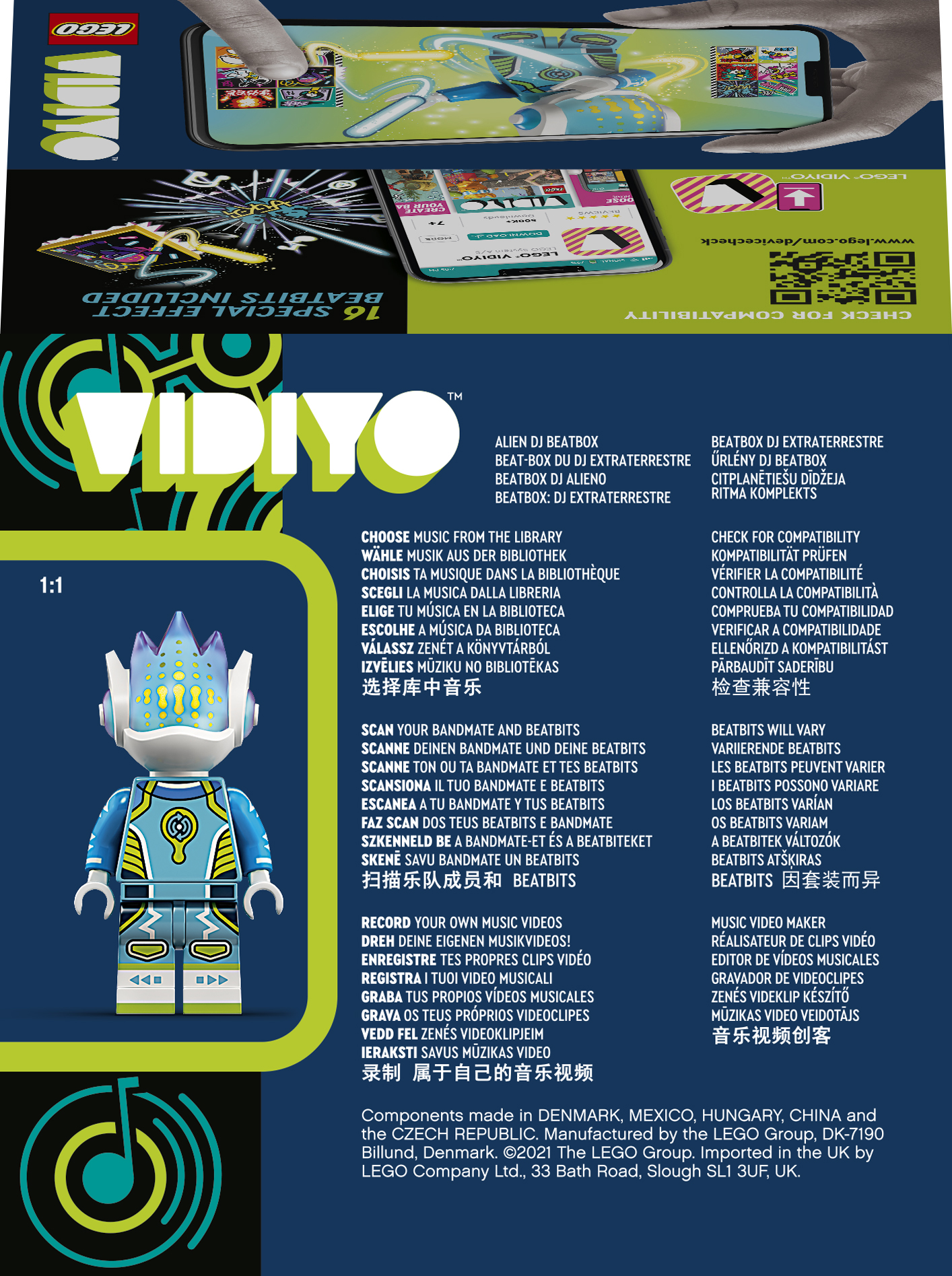 • Innusta lapsi lavastama oma muusikavideoid ja nendes peaosa mängima LEGO® VIDIYO™ Alien DJ BeatBoxi (43104) abil. Komplektis on tulnukast DJ minifiguur, vinüülplaat, 14 juhuslikku BeatBiti ja kaks erilist BeatBiti. • Laadi alla tasuta rakendus LEGO® VIDIYO™, et skannida minifiguuri ja eriefektidega BeatBite. Lastel on põnev vaadata, kuidas nende tegelane ärkab muusikavideos ellu. • Skanni rakenduses BeatBite, et avada eriefekte, nt valguspulga efekt, mis jätab tegelaste tantsimise käigus valgusjäljed. • Vahva muusikalahendus vähemalt 7-aastasele poisile või tüdrukule, kes väärib preemiat. See mängukomplekt on ka suurepärane pühadekingitus lapsele, kes armastab muusikamänguasju, tantsimist ja esinemist. • BeatBox on 8 cm kõrgune, 7 cm pikkune ja 9 cm laiune. • BeatBox käib kokku, et lapsed saaksid oma muusikalise maailma endaga igale poole kaasa võtta. BeatBoxis on ruumi klotsidest ehitatud lava, 16 BeatBiti ja tulnukast DJ vinüülplaadi jaoks. • LEGO® VIDIYO™ rakendus ühildub valitud iOS-i ja Androidi seadmetega. Teavet ühilduvuse kohta leiad veebilehelt www.LEGO.com/devicecheck. Lapsed peaksid küsima interneti kasutamiseks oma vanematelt luba. • LEGO® VIDIYO™ komplektid pakuvad uut seltskonnamänguelamust, kus poisid ja tüdrukud saavad olla lavastajad, produtsendid ja muusikatähed, lavastades ning jagades oma muusikavideoid. • LEGO® detailid vastavad tööstusharu rangetele nõuetele, et tagada nende stabiilne kvaliteet, ühtesobivus ja kindel ühendatavus alati. Nii on see olnud aastast 1958. • LEGO® osi kukutatakse, kuumutatakse, muljutakse, väänatakse ja analüüsitakse. Nii võid kindel olla, et need vastavad rangetele üleilmsetele ohutusstandarditele.