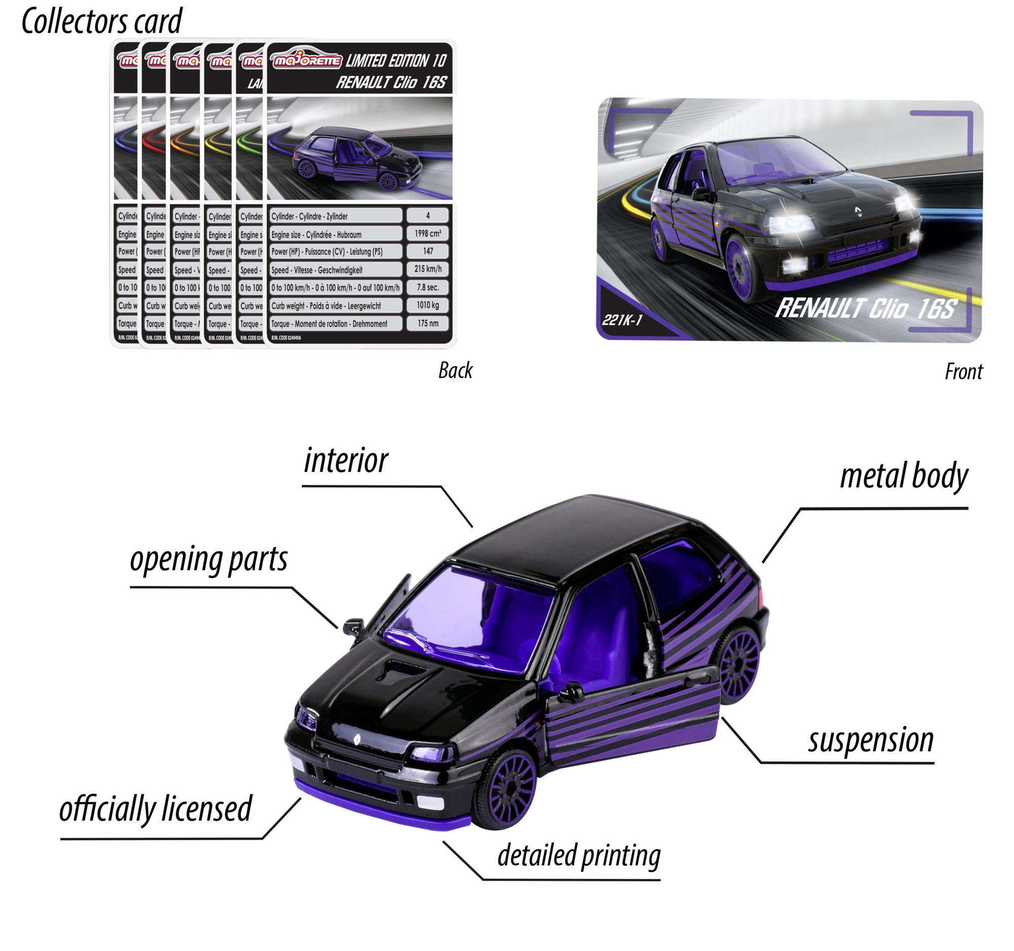 Valikus on kuus eksklusiivset ametlikult litsentseeritud mudelit (Renault, Porsche, Ford, Nissan, Lamborghini), mis on valmistatud detailitäpselt ja vastupidavalt. Erilise lisandväärtuse loovad survevalumeetodil valmistatud autod pöörlevate rataste ja vedrustusega, avatavad detailid koos pilkupüüdva kahevärvilise disainiga ning iga mudeliga kaasas olev kollektsionääri kaart põhiandmetega.