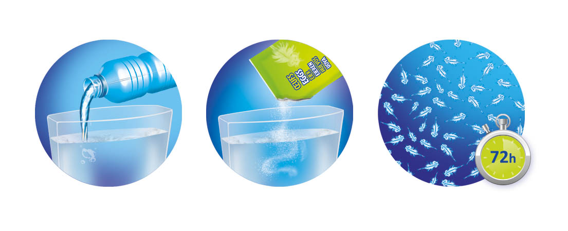 Karbis on: Pakend munadega, pakend toiduga, lusikas, akvaarium ja pipett. Sa vajad ka pudelivett, mis pole tootega kaasas.